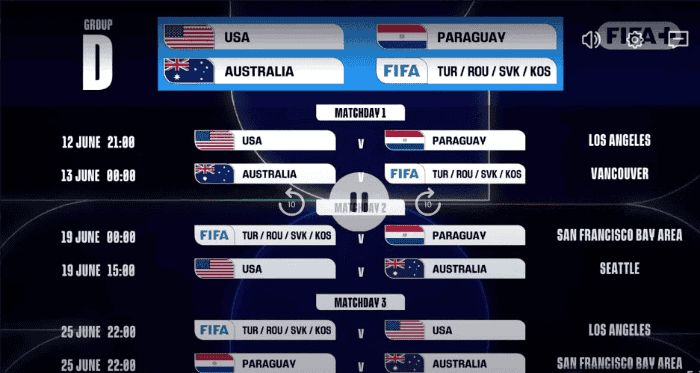 El 19 de junio, a las 00:00 horas en el Área de la Bahía de San Francisco, el ganador del Play-Off de Europa jugará ante Paraguay. Ese mismo día, a las 15:00 horas en Seattle, Estados Unidos enfrentará a Australia.