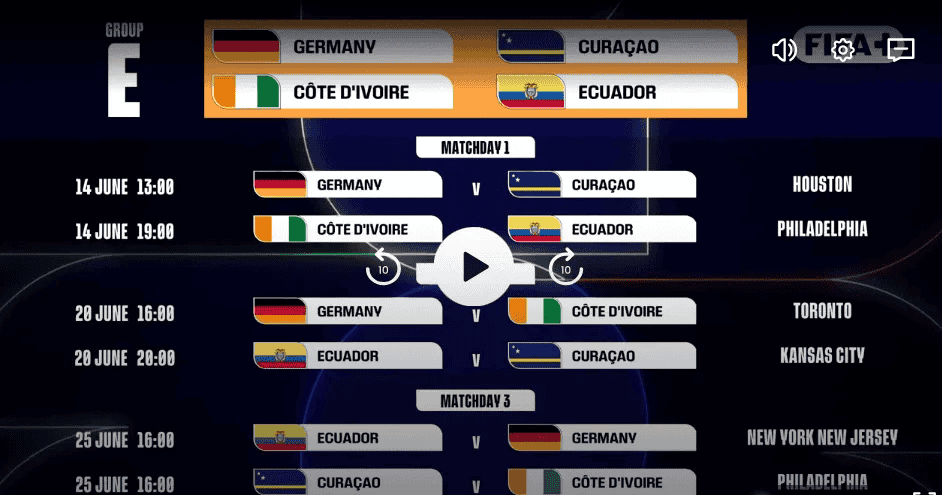 Finalmente, el 25 de junio a las 16:00 horas en Nueva York-Nueva Jersey, Ecuador se medirá con Alemania. A la misma hora, en Filadelfia, Curazao jugará ante Costa de Marfil.