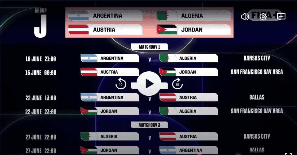 Finalmente, el 27 de junio a las 22:00 horas en Kansas City, Argelia se medirá con Austria. A la misma hora, en Dallas, Jordania jugará ante Argentina.