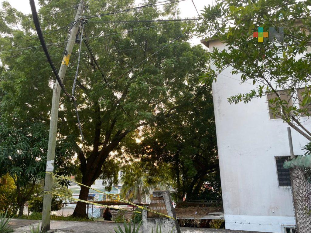 La estructura se encuentra en andador Piratas, esquina Andador Costera en el municipio de Boca del Río. Enfrente a las viviendas de Aniceto y María de los Ángeles, habitantes desde hace más de 40 años de la colonia, quienes afirman que este poste representa un peligro para su seguridad.