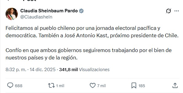 La presidenta de México, Claudia Sheinbaum, felicitó al pueblo chileno por una jornada pacífica y democrática, y reconoció a Kast como presidente electo, expresando la disposición de su gobierno a continuar la cooperación regional.