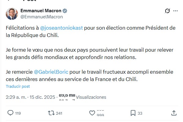 A estas reacciones se sumó el presidente de Francia, Emmanuel Macron, quien felicitó a José Antonio Kast por su elección y expresó su deseo de que ambos países continúen trabajando juntos para enfrentar los grandes desafíos globales y profundizar su relación bilateral. Macron también agradeció al presidente saliente, Gabriel Boric, por el trabajo conjunto realizado en los últimos años.