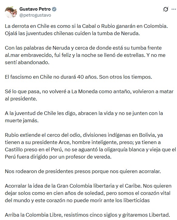El presidente de Colombia, Gustavo Petro, reaccionó con un mensaje crítico, en el que comparó el resultado electoral chileno con el avance de la extrema derecha en la región y advirtió sobre los desafíos democráticos que enfrenta el país.