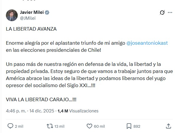 El presidente de Argentina, Javier Milei, celebró el triunfo de Kast como un avance de la libertad en la región y expresó su intención de trabajar de manera coordinada con el nuevo gobierno chileno.