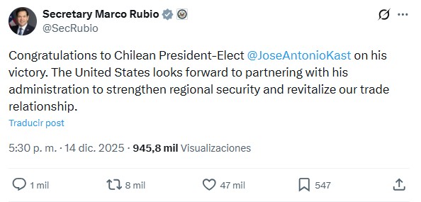 Desde Estados Unidos, el secretario de Estado Marco Rubio felicitó al presidente electo y señaló que su país espera fortalecer la seguridad regional y revitalizar la relación comercial con Chile.