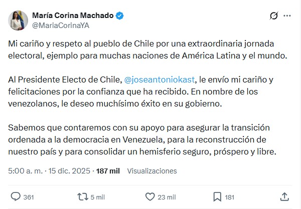 María Corina Machado felicitó a Kast y al pueblo chileno, y expresó su expectativa de contar con el respaldo del nuevo gobierno para una transición democrática en su país.