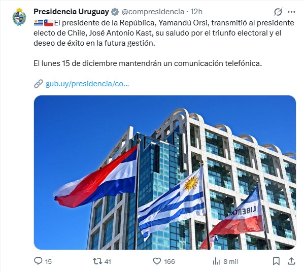 La Presidencia de Uruguay informó que el presidente Yamandú Orsi transmitió a José Antonio Kast su saludo por el triunfo electoral y le deseó éxito en su futura gestión. Ambos mandatarios mantendrán una comunicación telefónica como primer acercamiento oficial.