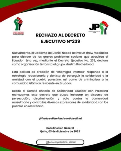 Con información de PRENSA LATINA https://www.prensa-latina.cu/2025/12/05/rechazan-en-ecuador-decreto-de-noboa-sobre-hermanos-musulmanes/