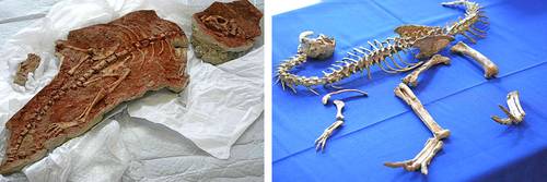 ▲ Después de 10 años de haber sido confiscados por la aduana francesa, artefactos culturales prehistóricos fueron restituidos ayer a las autoridades mongolas en el edificio del Ministerio de Economía y Finanzas (Bercy), en París. La imagen de la derecha muestra un Tarbosaurus baatar, primo asiático del T-Rex.Foto Afp