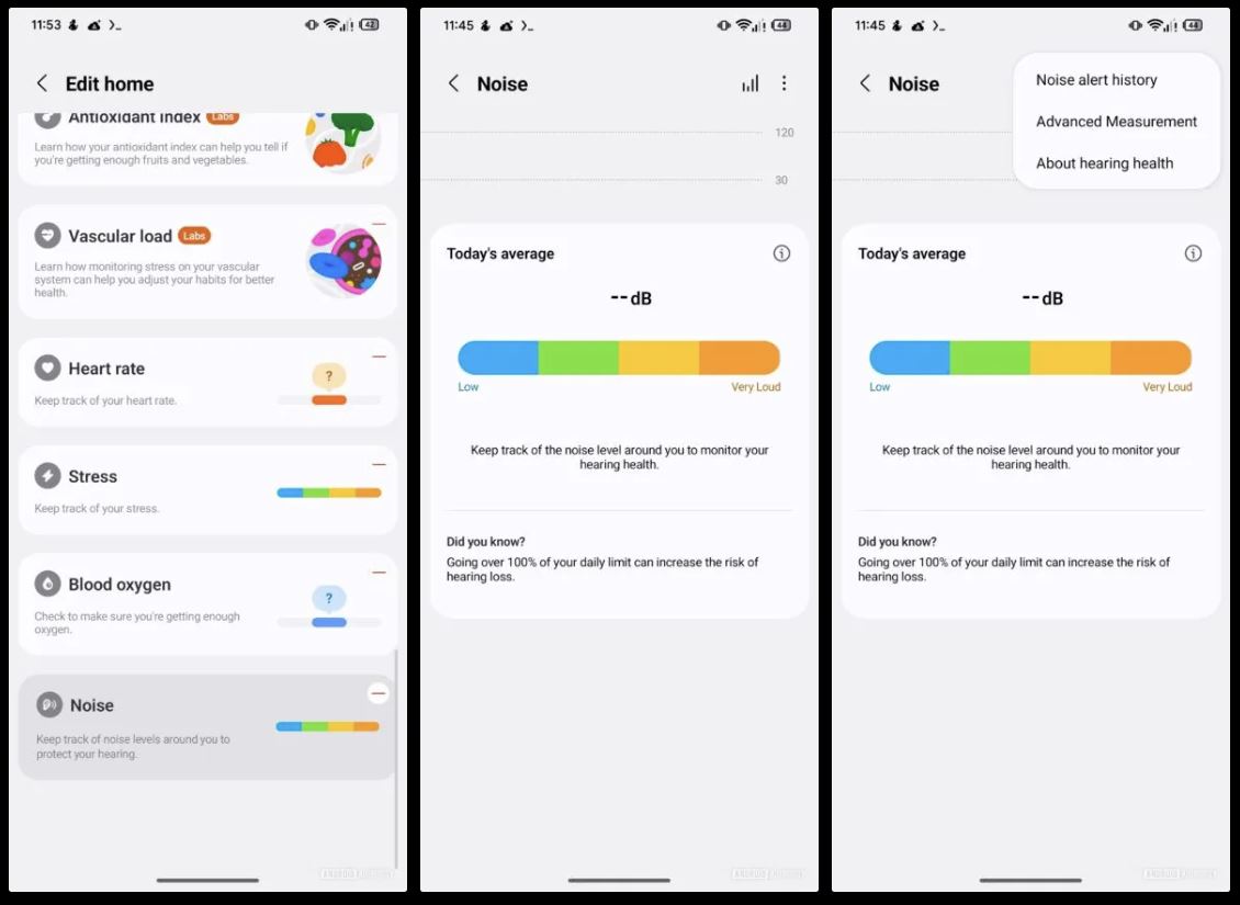Por otro lado, una función oculta descubierta por Android Authority muestra que Samsung Health podría monitorear los niveles de ruido en un futuro. La aplicación incluye una sección en la que se detalla el promedio de ruido (en decibelios) que experimentas cada día. La idea es proteger tu audición eliminando el riesgo de pérdida auditiva con el paso del tiempo.