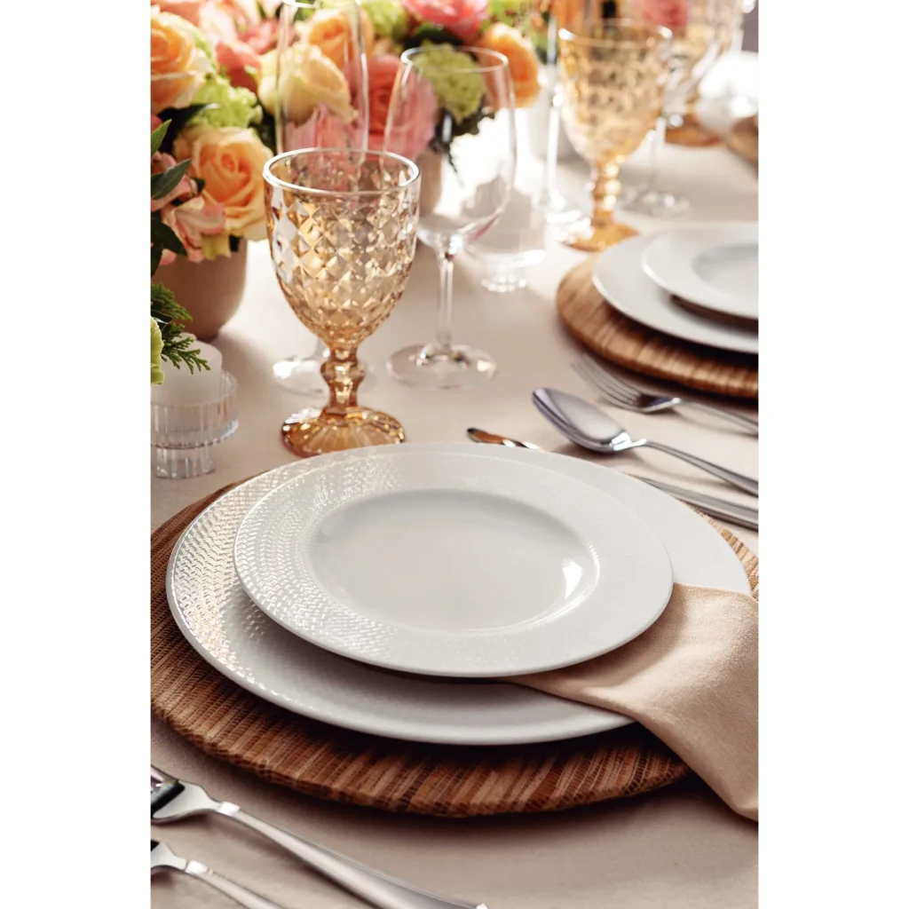 ● Optar por vajillas blancas o neutras es una decisión práctica, pues su versatilidad permite que todos los platillos se conviertan en los verdaderos protagonistas, adaptándose a cualquier tipo de decoración festiva.
