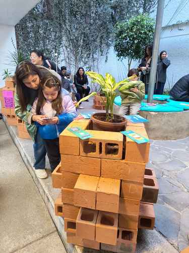 La disposición del espacio es mínima y precisa. En la sala principal se dispusieron pilares de ladrillo intercalados con plantas; en algunos se colocaron códigos QR y, en otros, cojines para sentarse.