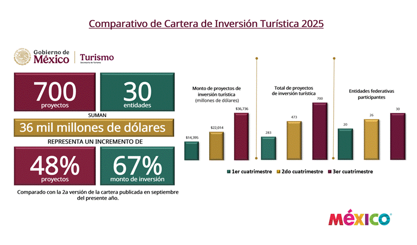 Ciudad de México.- La secretaria de Turismo del Gobierno de México, Josefina Rodríguez Zamora, informó que la Cartera de Inversión Turística 2025 cerró el año con 700 proyectos activos en 30 entidades federativas, los cuales representan una inversión conjunta de 36 mil 735 millones de dólares (mdd).