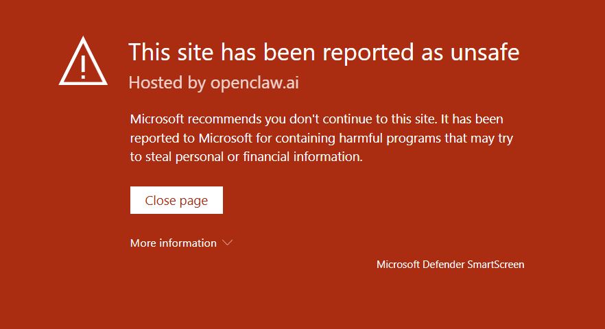 OpenClaw permite el acceso completo y sin restricciones al ordenador, lo que representa un riesgo si lo ejecutas desde el repositorio oficial o el clonado. Curiosamente, la web oficial está marcada como insegura por algunos navegadores como Microsoft Edge. Si intentas acceder al enlace, encontrarás un mensaje que advierte que atacantes podrían instalar programas peligrosos en tu ordenador para robar o eliminar tu información.