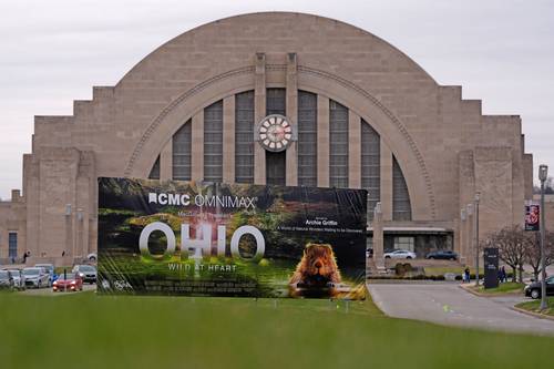 ▲ Promocional de la película Ohio Wild at Heart, sobre los parques naturales, frente al teatro Omnimax en la terminal de trenes de Cincinnati.Foto Ap