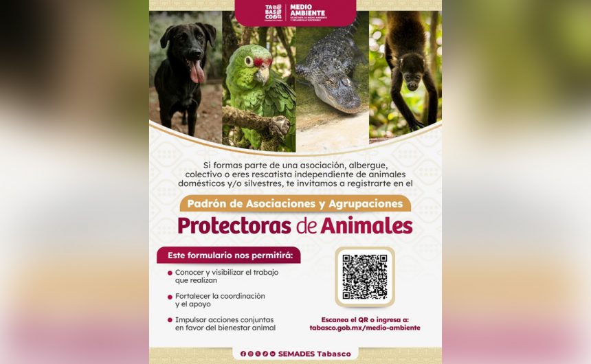 Con el objetivo de fortalecer las acciones de protección y bienestar animal en el estado, la Secretaría de Medio Ambiente y Desarrollo Sostenible (SEMADES) anuncia el lanzamiento del Padrón de Asociaciones y Agrupaciones Protectoras de Animales, una herramienta que permitirá contar, con una base de datos actualizada y confiable de las organizaciones, colectivos, albergues y personas rescatistas que trabajan en favor de los animales, tanto de manera formal como informal.