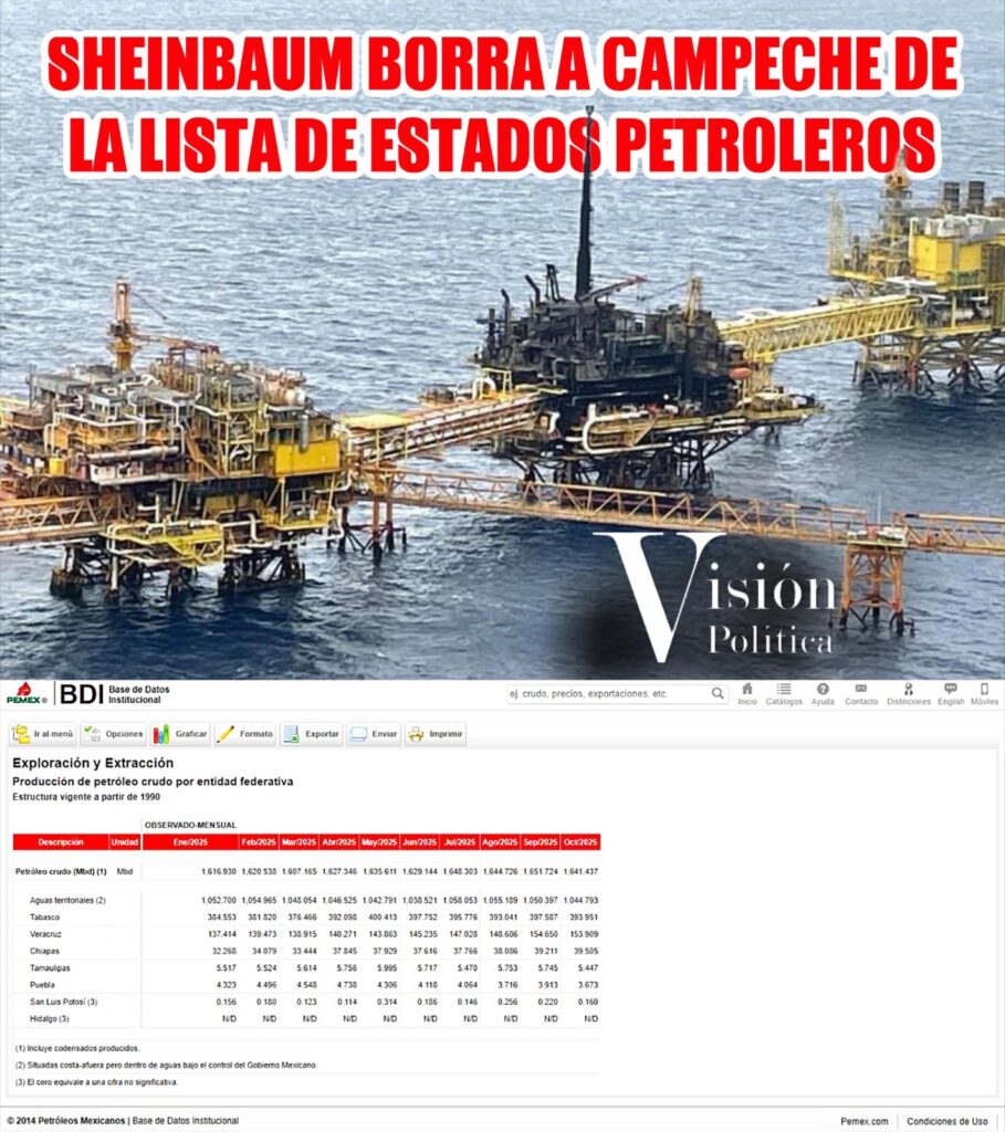 De acuerdo con los datos públicos del portal web Base de Datos Institucional de Pemex (BDI), Petróleos Mexicanos (Pemex) borró a Campeche de su lista oficial 2025 de entidades federativas productoras de petróleo crudo, y lo sustituyó por “Aguas Territoriales” con la nota adicional: “Situadas costa-afuera pero dentro de aguas bajo el control del Gobierno Mexicano”, a pesar de que la región campechana produjo en 2025 el 64.2 por ciento de todo el crudo de la nación.