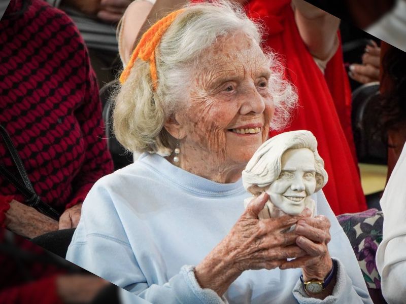 En un homenaje a sus 93 años, Elena Poniatowska asistió conmovida al reconocimiento que le rindió el colectivo Los laureles de arte, donde celebró el cariño de lectoras y lectores.