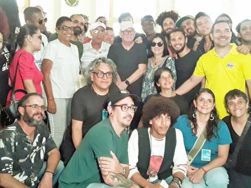 ▲ Silvio Rodríguez (en medio con playera negra y gorra blanca) dialogó con trovadores y admiradores.Foto Prensa Latina