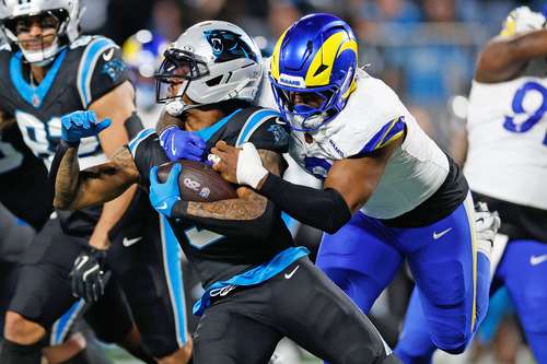 ▲ El corredor de Carolina Panters Rico Dowdle es detenido por el linebacker de Los Ángeles Rams Jared Verse en la primera mitad del partido ayer en Charlotte, Carolina del Norte.Foto Ap
