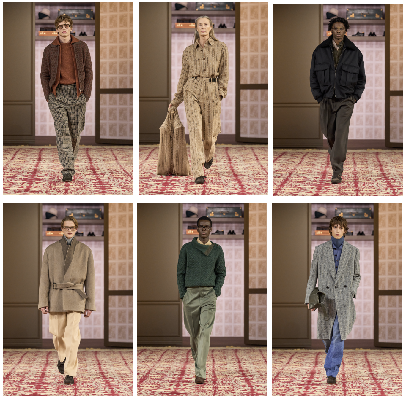 La silueta es larga y holgada, la actitud dégagé, la presencia correcta. Abrigos y chaquetas son más largos y amplios, con hombros cuadrados; el volumen completo de los pantalones fluye desde una cintura alta y ceñida. Símbolo de cierta rigidez, el cierre cruzado se vuelve lúdico: en algunas chaquetas se reduce a un tercio, mientras que en otras se reinterpreta con la adición de un botón horizontal central colocado entre los cierres tradicionales, lo que permite llevar la prenda como un clásico cruzado o abrocharla en una opción intermedia, creando un ajuste más suelto y abierto. La idea de permitir múltiples formas de uso es constante: los blazers cuentan con doble juego de solapas y camisas con doble cuello. Las overshirts son fluidas y elegantes; los bombers de piel de oveja o de punto aportan textura y calidez.