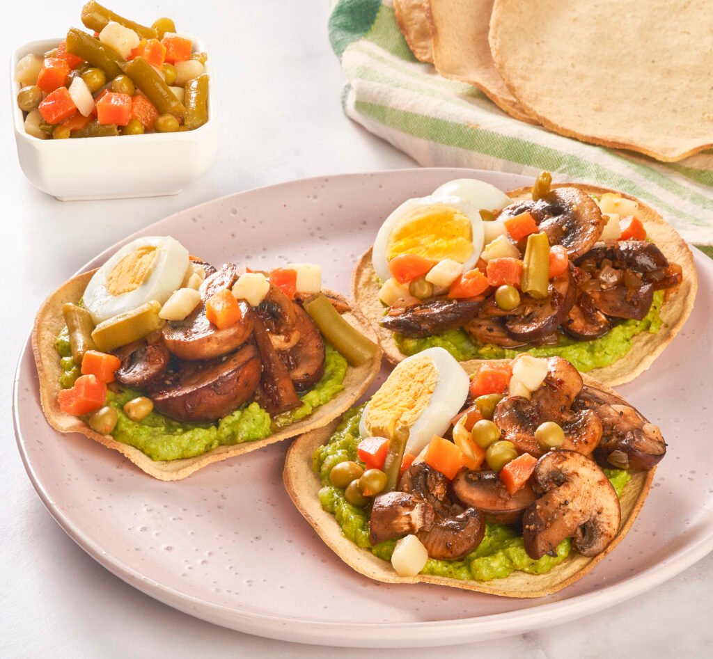 La cebolla se sofríe en aceite antes de añadir los champiñones y los Chipotles Picados La Costeña®, que se sazonan y se terminan con cilantro fresco. El guiso se coloca sobre una base de aguacate y se completa con Ensalada de Verduras La Costeña® y rebanadas de huevo duro, logrando un contraste entre lo caliente y lo fresco en cada bocado.