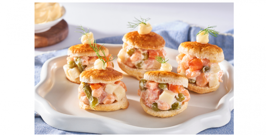 En un recipiente se mezclan Mayonesa y Ensalada de Verduras La Costeña® con alcaparras, salmón, eneldo, sal y pimienta. La preparación se coloca dentro de volovanes cortados por la mitad, se cubren y se presentan listos para servirse.