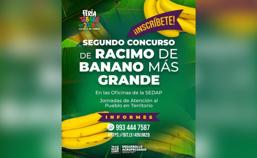 Con el objetivo de impulsar y reconocer el esfuerzo del sector productivo, la Junta de Gobierno de la Feria Tabasco, a través de la Secretaría de Desarrollo Agropecuario y Pesca (SEDAP), mantiene abiertas las inscripciones para las y los productores interesados en participar en el Segundo Concurso del Racimo de Banano Más Grande, que se realizará el próximo 7 de mayo en el marco de la máxima fiesta de los tabasqueños.