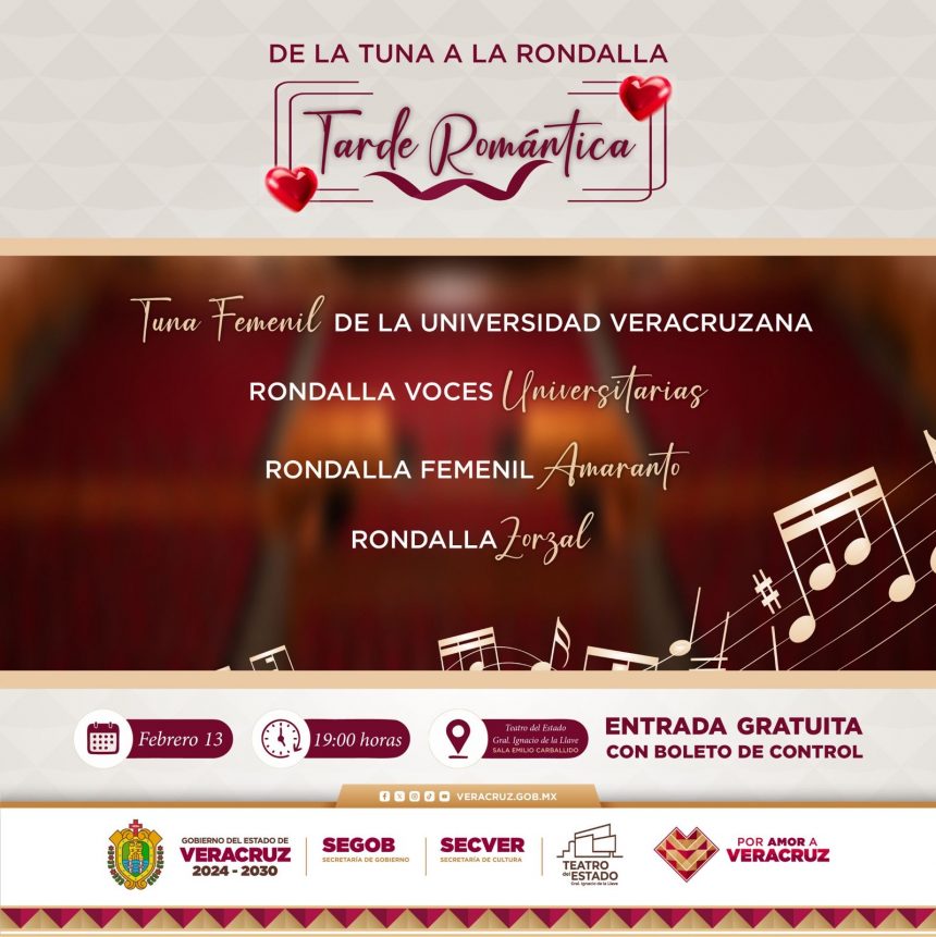 Xalapa, Ver.- Con motivo del Día del Amor y la Amistad, la Secretaría de Cultura de Veracruz y la Coordinación de Promoción de los Valores Cívicos y Culturales invitan al público en general a disfrutar del concierto romántico De la Tuna a la Rondalla: Tarde Romántica, este viernes 13 de febrero, a las 19:00 horas, en la Sala Emilio Carballido del Teatro del Estado General Ignacio de la Llave.