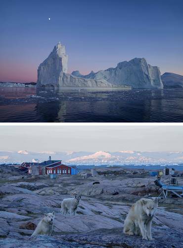 ▲ Iceberg flotando en la bahía de Disko, en Ilulissat, Groenlandia. Y perros de trineo de la región.Foto Ap