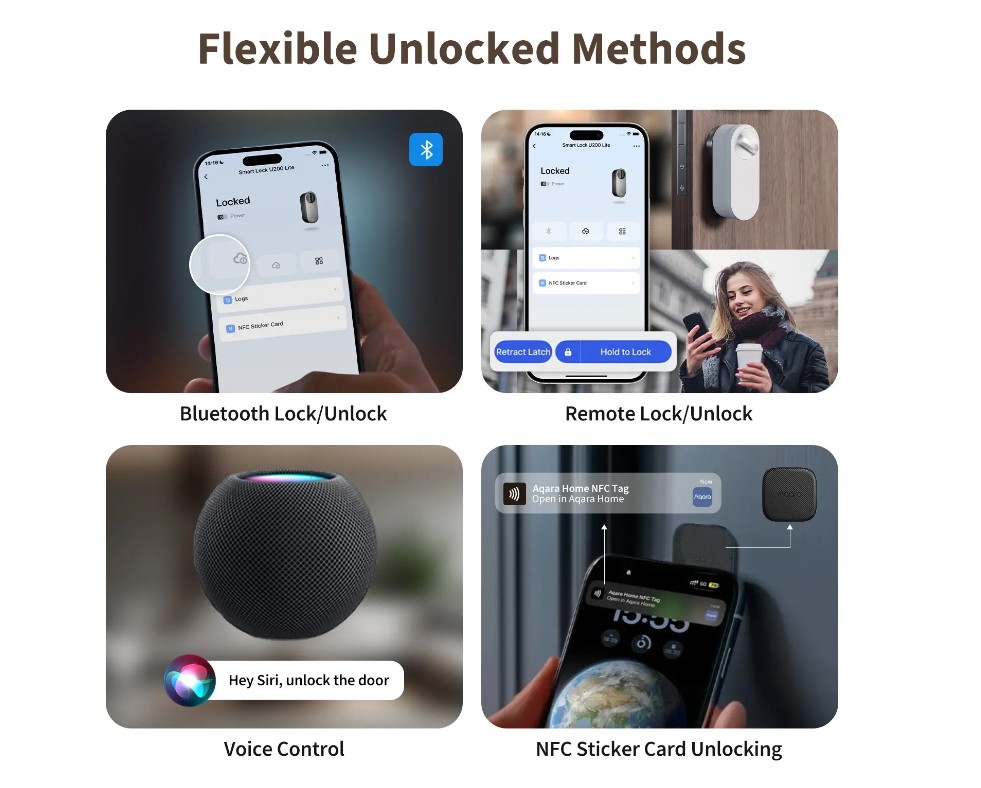 Cerradura Inteligente Aqara 200 Lite, batería de seis meses. Control desde aplicación y apertura con NFC. Compatible con Alexa y Google. Tres modos de apertura: estándar, silencioso y rápido.