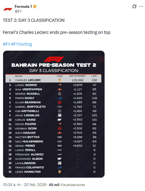 Charles Leclerc concluyó la pretemporada de F1 como el piloto más veloz de este viernes. Los tres pilotos más rápidos en el último día de pruebas en Bahrein, que es la última tanda de ensayos de Fórmula 1, previo a su comienzo oficial, fueron Leclerc (Ferrari) con un tiempo de 1:31.992; Lando Norris (McLaren) con 1:32.871; y Max Verstappen (Red Bull) con 1:33.109.