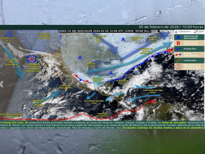 La Coordinación Nacional de Protección Civil alertó sobre condiciones meteorológicas adversas en gran parte del país. Además, llamó a la población a mantener medidas de autocuidado ante las lluvias, los fuertes vientos y el descenso de temperaturas provocados por el Frente Frío número 33.