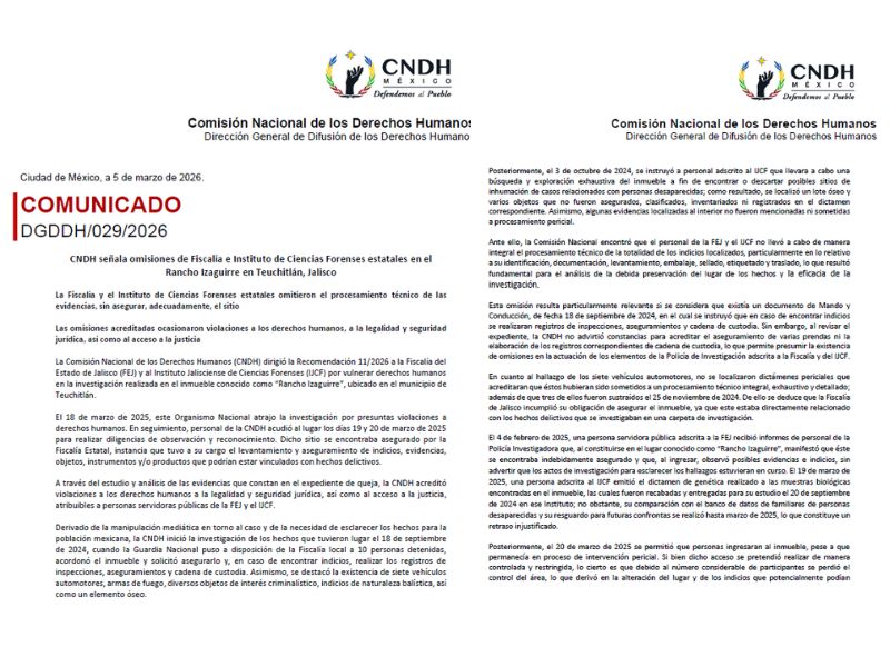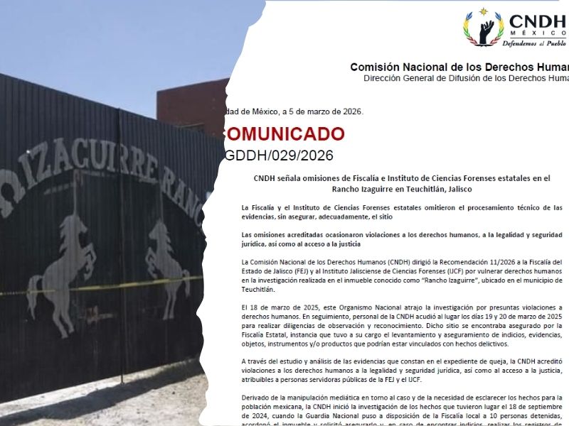 A un año del hallazgo del Rancho Izaguirre, en Teuchitlán, Jalisco, la Comisión Nacional de Derechos Humanos determinó que la Fiscalía y el Instituto de Ciencias Forenses del estado incurrieron en una serie de omisiones que vulneraron derechos humanos, así como el derecho a la legalidad y seguridad jurídica y el acceso a la justicia.