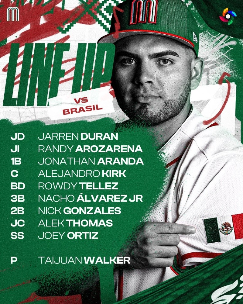Eric Pardinho abre por Brasil y comienza retirando a Jarren Durán, quien se poncha abanicando. Después, Randy Arozarena batea doblete al jardín izquierdo y enseguida Jonathan Aranda conecta sencillo al jardín derecho para que Arozarena anote la primera carrera. Posteriormente, Alejandro Kirk pega doblete al jardín central y Aranda también llega al plato, mientras que Rowdy Téllez recibe base por bolas intencional.