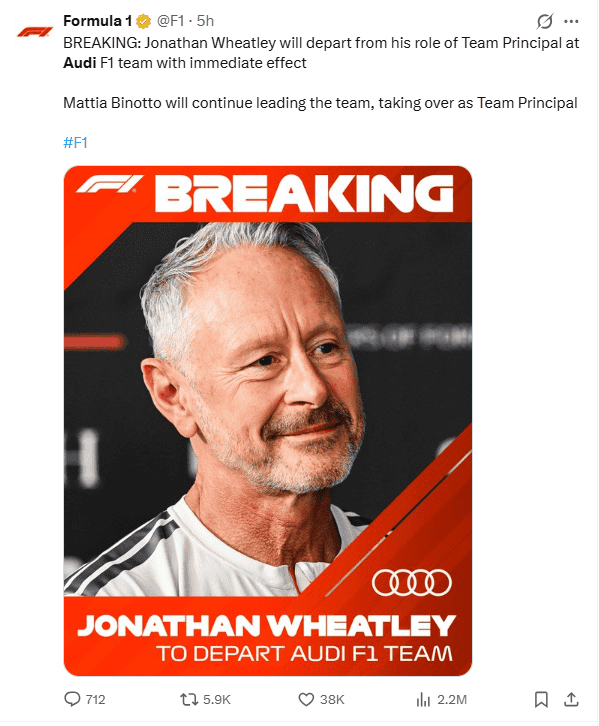 Fórmula 1 anunció a través de sus redes sociales que Jonathan Wheatley, jefe del equipo de Audi en el certamen de automovilismo internacional, se marchaba “con efecto inmediato por motivos personales”.