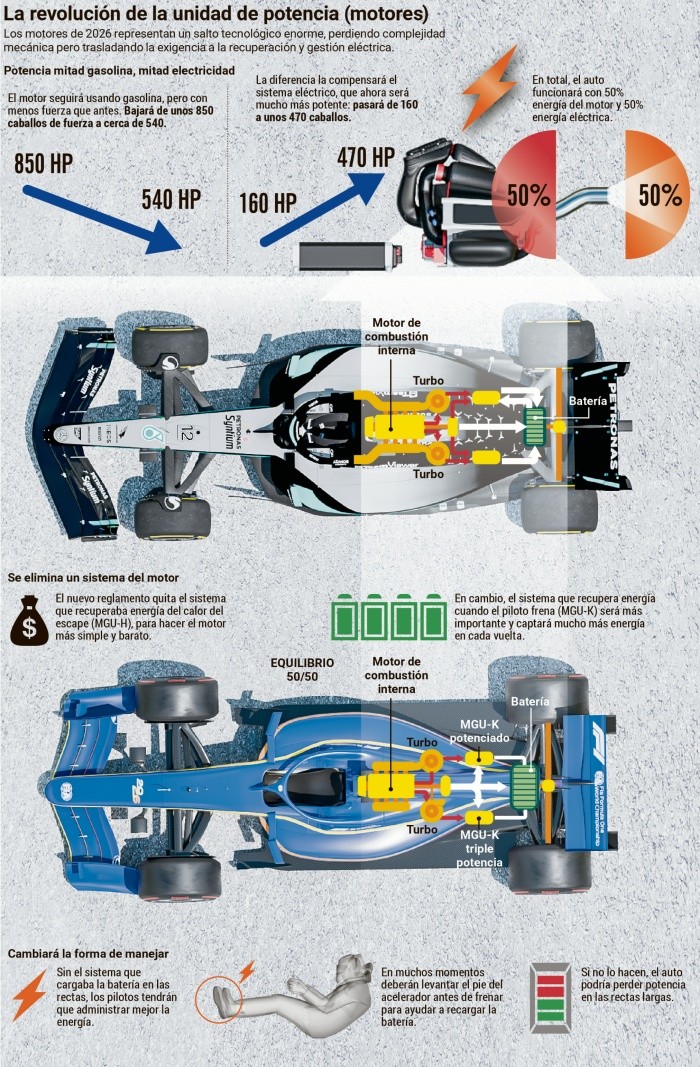 “Los autos ahora serán 50% eléctricos y 50% de combustión interna. Eso modifica por completo la filosofía”, explica Cortés. “A la nueva unidad de potencia se suman la aerodinámica activa y un sistema de adelantamiento que sustituye al DRS por un esquema de energía extra disponible cuando el piloto está a menos de un segundo del rival, además de un botón de ‘boost’ que exige recuperación constante durante la carrera”.