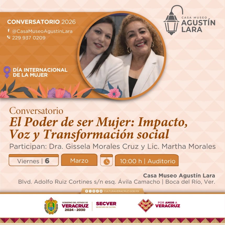 Xalapa, Ver.- La Secretaría de Cultura de Veracruz (SECVER) invita al Conservatorio El poder de ser mujer: impacto, voz y transformación social, que se llevará a cabo mañana a las 10:00 horas, en el Auditorio de la Casa Museo Agustín Lara, en Boca del Río, en el marco del Día Internacional de la Mujer. La entrada es libre.