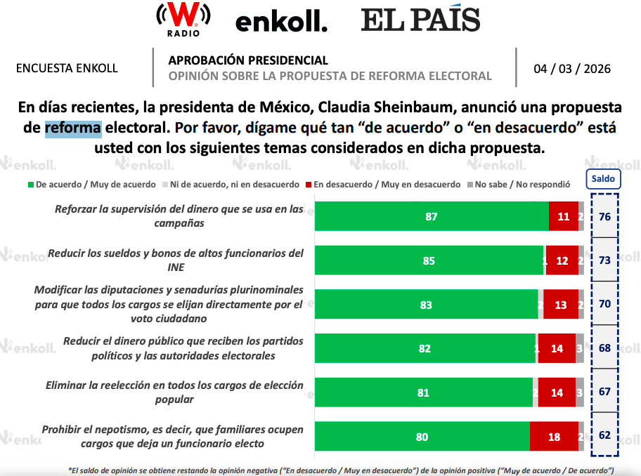 Una encuesta elaborada por la agencia Enkoll revela que la mayoría de las propuestas incluidas en la Reforma Electoral impulsada por la presidenta Claudia Sheinbaum cuentan con niveles de aprobación superiores al 80 por ciento entre la población.