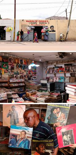 ▲ En el barrio de Bacongo, en Brazzaville, República del Congo, está la tienda de discos Maravillas del Pasado. El dueño del local, Guy Samba, afirma haber heredado esta colección de discos de vinilo tras el fallecimiento de su padre, y lo que desea es transmitirla a sus hijos. Los clientes pueden comprar casetes, devedés y discos de acetato. Para renovar su colección, ofrece comprarlos a quienes deseen venderlos. La primera imagen, del frente del expendio, una vista general de su colección, y con unos de sus álbumes favoritos.Foto Afp