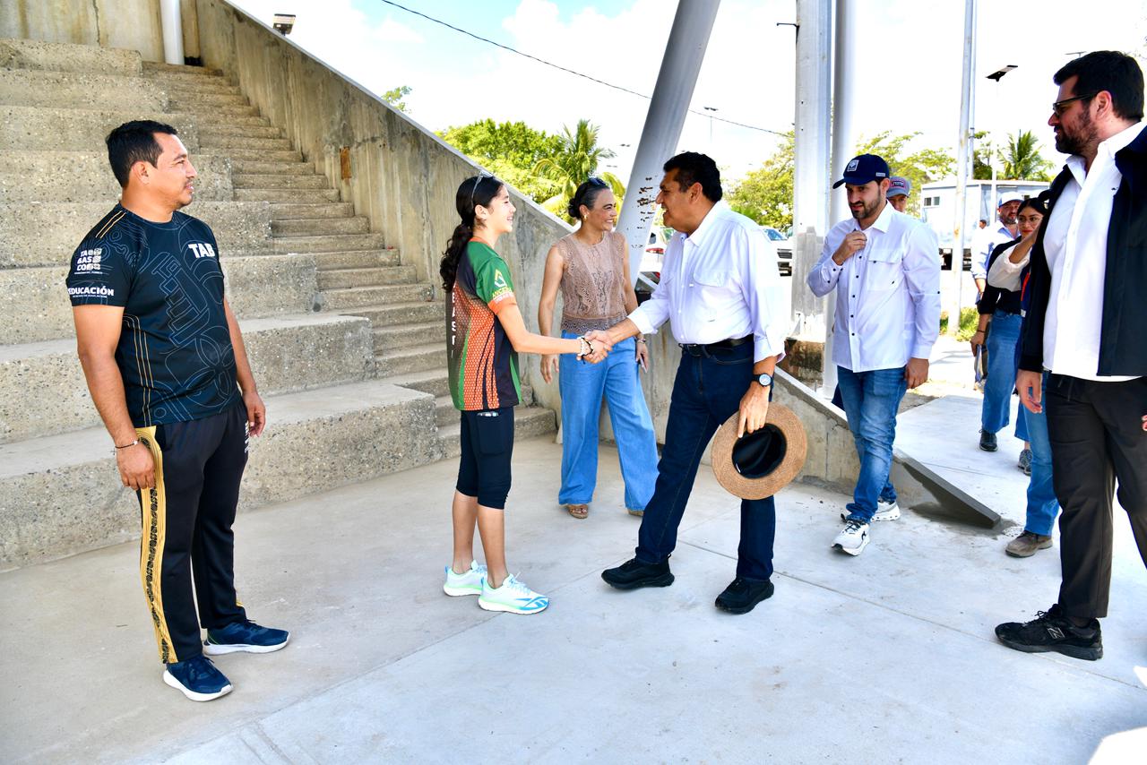 Durante su gira de trabajo que inició en Teapa y luego se trasladó al municipio de Centro, el mandatario verificó los avances de la construcción del Patinódromo en la Unidad Deportiva Olimpia XXI, obra en la que el Gobierno del Pueblo invierte poco más de 23 millones de pesos.