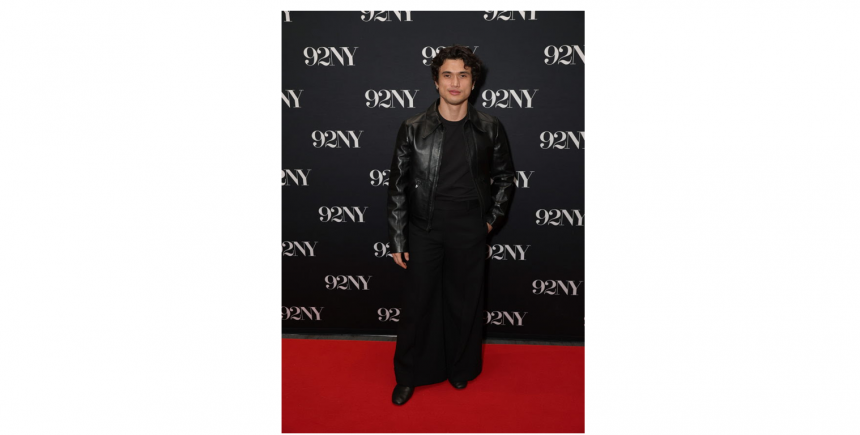 Charles Melton, embajador global de Coach y actor, luce una chaqueta estilo blouson, camiseta, pantalones acampanados y zapatos derby hechos a medida de la colección Otoño 2026 para el estreno de Beef.