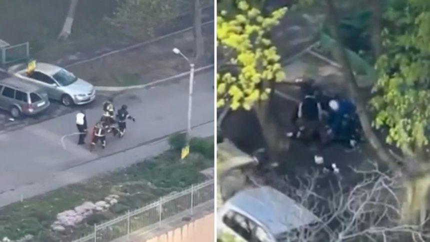 Testigos han publicado en las redes sociales varios videos que muestra el momento en el que un hombre armado con una ametralladora abrió fuego este sábado contra varias personas en una zona urbana de la capital ucraniana, Kiev.