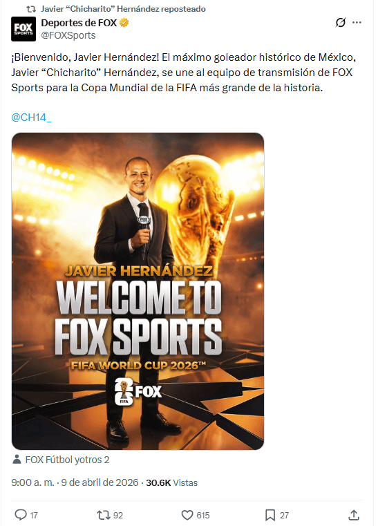 “¡Bienvenido, Javier Hernández! El máximo goleador histórico de México, Javier ‘Chicharito’ Hernández, se une al equipo de transmisión de FOX Sports para la Copa Mundial de la FIFA más grande de la historia“.