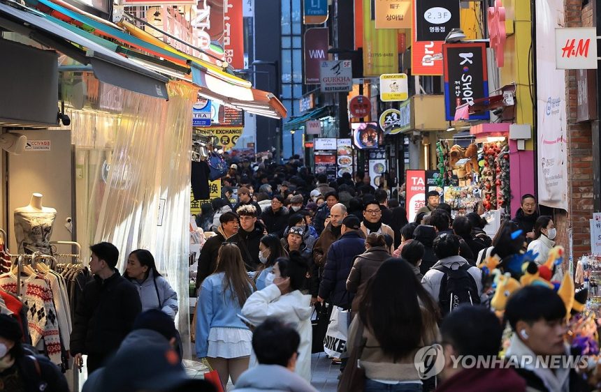 La foto de archivo, tomada el 18 de febrero de 2026, el último día de los festivos por el Año Nuevo lunar, muestra una calle del céntrico barrio comercial de Myeongdong, en Seúl, llena de turistas locales y extranjeros.