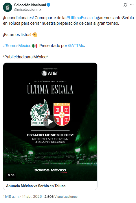 La Selección Mexicana de futbol ha definido su última escala antes de encarar la Copa del Mundo 2026. El combinado nacional se enfrentará a su similar de Serbia el próximo jueves 4 de junio en el Estadio Nemesio Díez en Toluca, Estado de México, según se dio a conocer este martes 14 de abril por parte del presidente y comisionado de la Federación Mexicana de Futbol, Mikel Arriola.