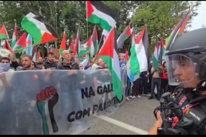 Manifestantes pro Palestina exigen la salida del equipo Israel Pro Tech de la vuelta a España 2025, que ha interrumpido…