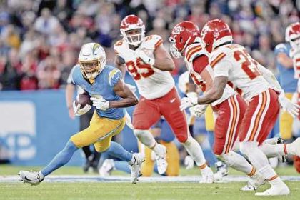 ▲ El receptor abierto de los Cargadores Tre Harris elude a la defensiva de los Jefes, durante su victoria 27-21…