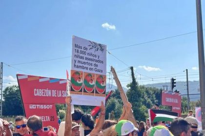 ▲ Con pancartas a favor de Palestina, manifestantes insisten en la expulsión del equipo israelí de la competición.Foto Europa Press…
