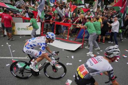 ▲ Inconformes ondearon banderas palestinas y vascas durante el paso de ciclistas de Israel.Foto Afp Armando G. Tejeda Corresponsal Periódico…